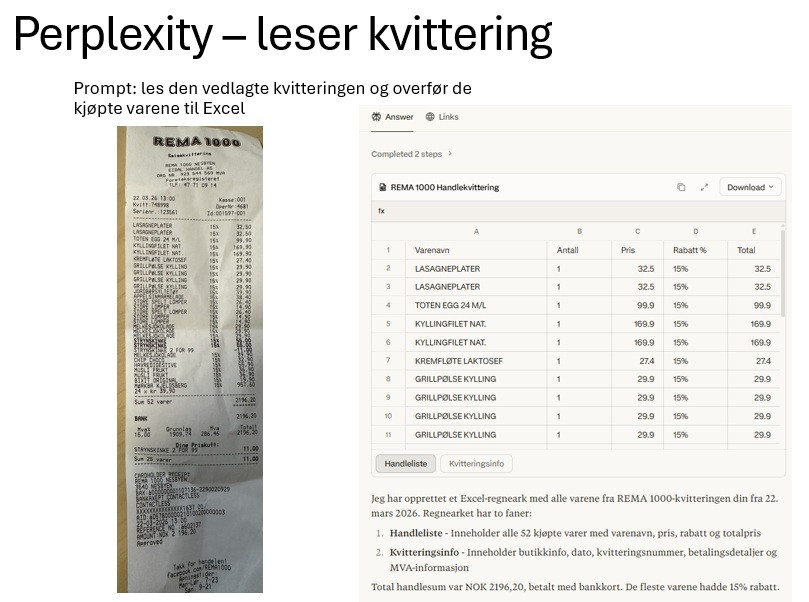 Kvittering → regneark (Perplexity)